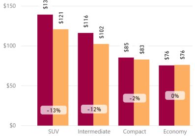 Refer to sales channels (Fig.2), duration (Fig.3) and vehicle category (Fig.4) graphs for the average rates during the month. Due to the peak season, the average for all durations and all vehicle categories increased, with the average rates for the SUV class almost doubling from November 2019.